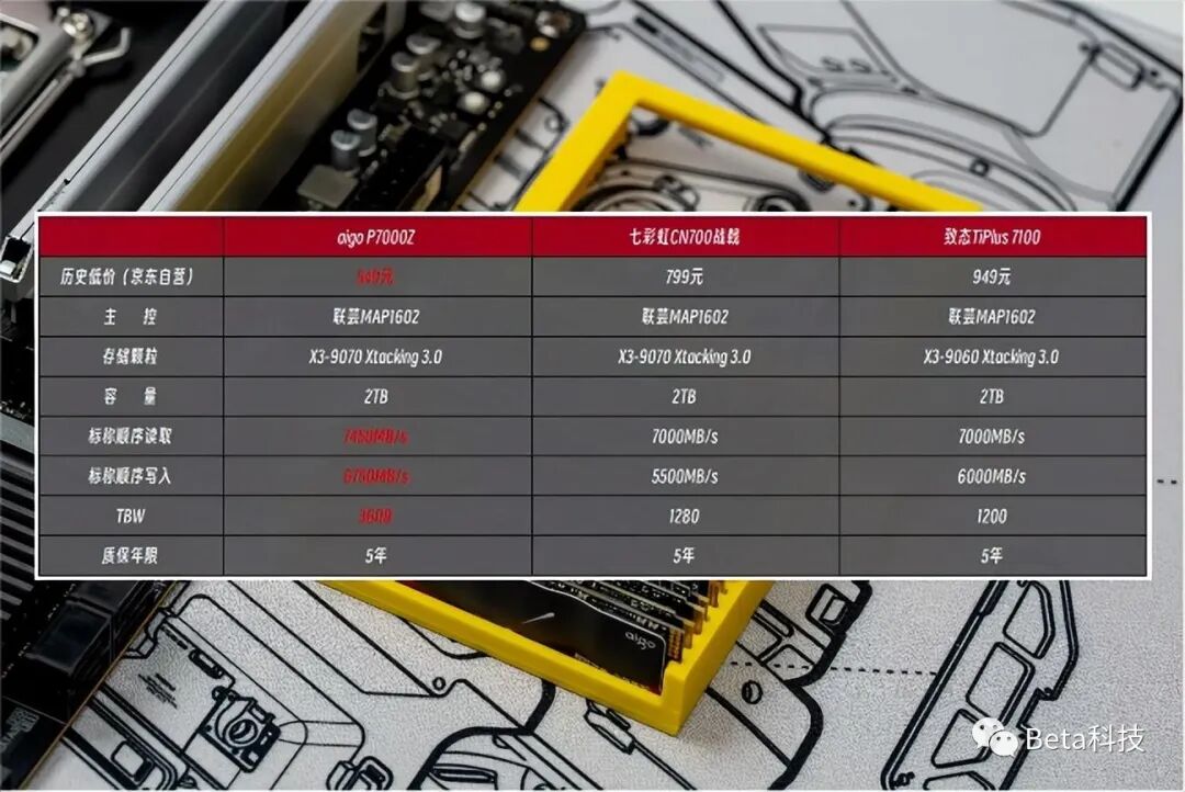 虽然容量都是2TB,但是七彩虹CN700战戟和致态TiPlus 7100的价格跟aigo P7000Z比起来是有很大差距的。如果装机的用户对价格比较敏感,选择aigo P7000Z的概率更大一些。