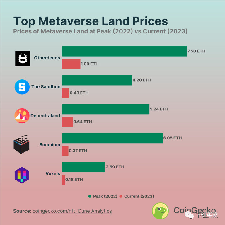 CoinGecko 在报告中表示,自 2022 年 1 月至今一年多的时间,5 款知名元宇宙土地价格均出现了大幅下滑。
