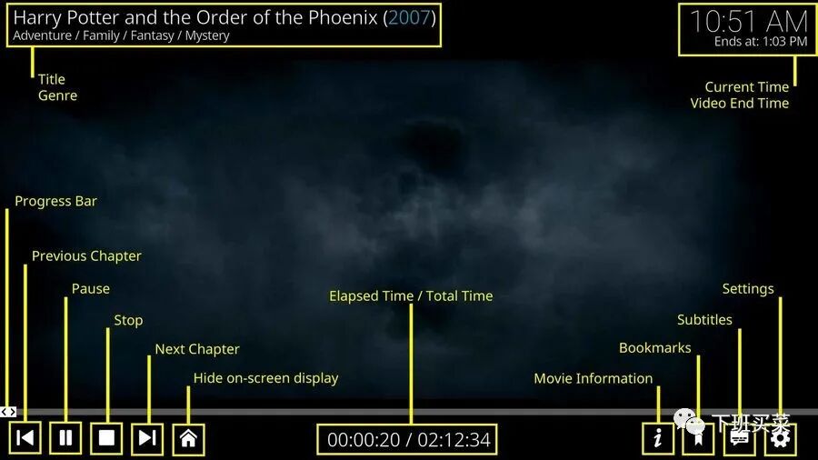 Kodi在播放电影时打开OSD菜单可以设置字幕与音轨、播放进度、播放状态等。电脑端鼠标移动到底部,电视端遥控器按菜单键即可打开OSD菜单。