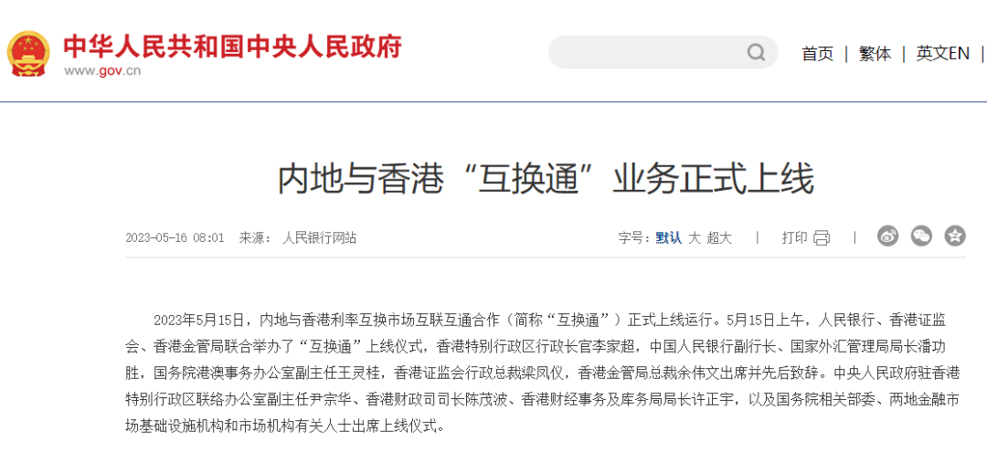 5月15日上午,人民银行、香港证监会、香港金管局联合举办“互换通”上线仪式。