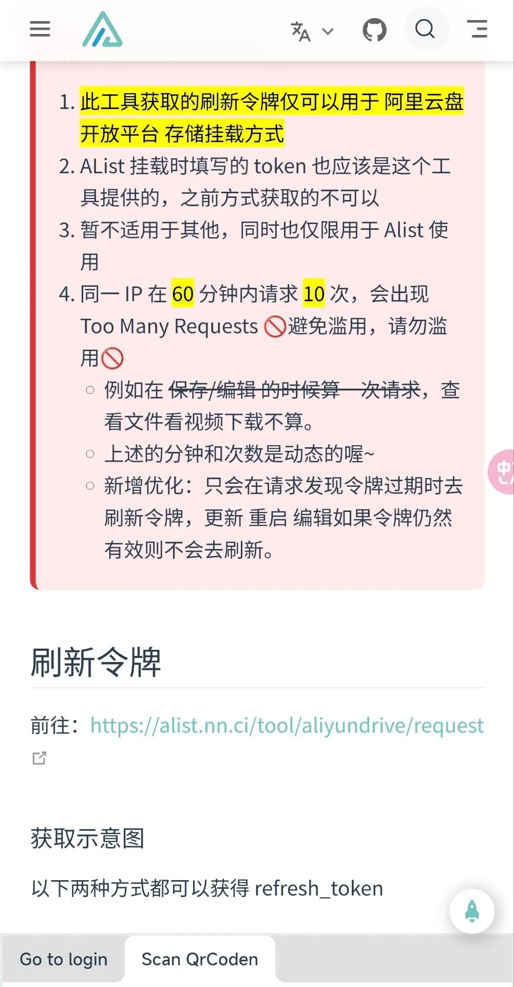 同时点开侧边菜单的文档,点击顶部的文A设置为中文,然后点击开始,点击阿里云盘Open,这里我们可以看到拿token的方法点击刷新令牌下面的链接,点击Scan QrCode也就是扫码登录,截图保存二维码,用阿里云盘APP扫一下即可登录,复制得到的token