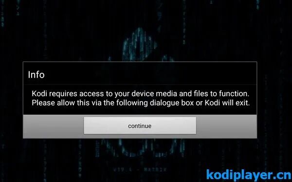 意思是Kodi没有读取文件的权限,需点击“continue”给予权限才能运行。因手机系统对软件的权限限制,需手动点击“允许”访问设备上的照片、媒体内容和文件。