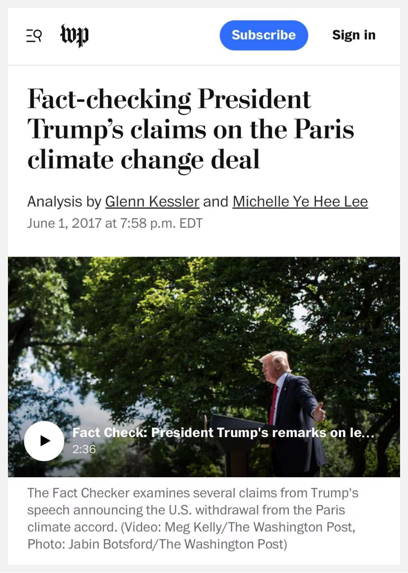 近半个世纪,各个国家都致力于改善环境。但由于环境问题是一个系统而复杂的大工程,牵一发而动全身,所以直到今天,无论从意愿还是能力上,都还有很多问题没有解决。往小了看,对一个企业而言,追求高额利润才是第一要义,环保是需要额外花钱的负担。比如几年前,美国国内航空燃油的单价是2美元,如果换成先进的生物燃料就变成5美元,换成电燃料则是更多的8美元,因此航空公司完全没有转型的动力。往大了看,环保是全人类共同的命题,但各国所处的发展阶段不同,出发点不同,环保的步调也并不一致,比如2017年美国突然宣布退出《巴黎协定》。● 华盛顿邮报对特朗普宣布退出《巴黎协定》所作报道