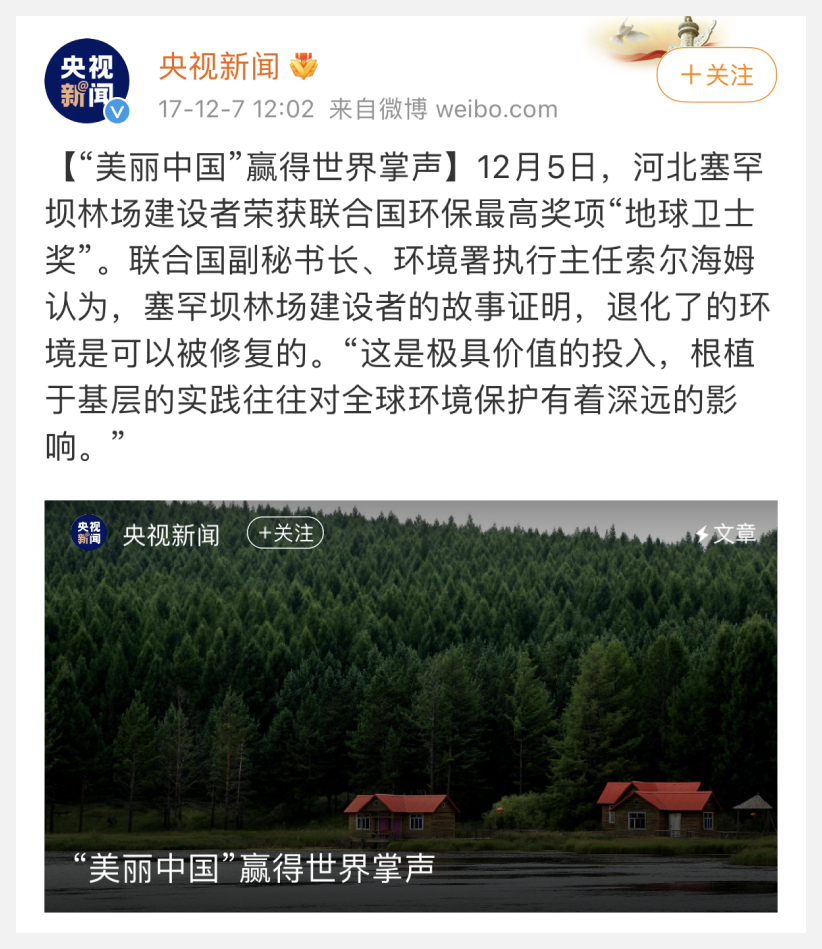 中国在环保上也一直走在前面,有着“绿色长城”之称的“三北”防护林,60年“荒原变林海”的塞罕坝,都是见证。2017年,联合国授予塞罕坝环境荣誉最高奖项——“地球卫士奖”。