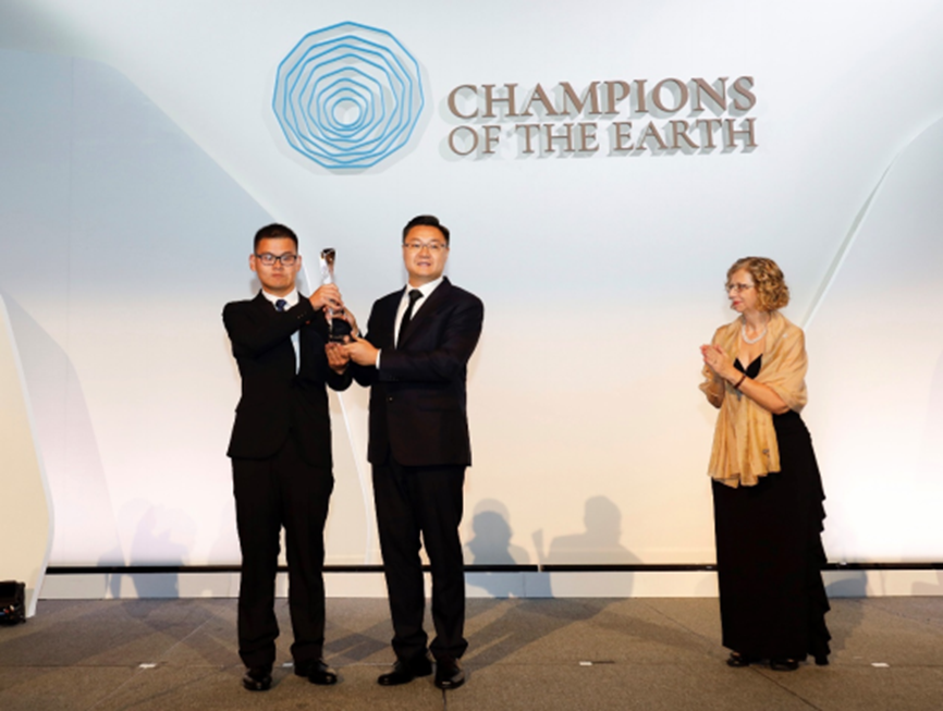 不是所有的问题都有答案,但努力的过程会引导我们找到正确的方向。看似距离普通人很远的低碳、环保,也许就在我们身边,有时候仅仅是缺少一个让人看见的契机。2019年,蚂蚁森林因唤醒社会公众的环保意识,推动绿色低碳在中国成为流行风尚,连获联合国环保领域最高奖项"地球卫士奖"与应对气候变化最高奖项"灯塔奖"。● 沈钧亮(左一)代表数亿蚂蚁森林用户捧起联合国“地球卫士奖”