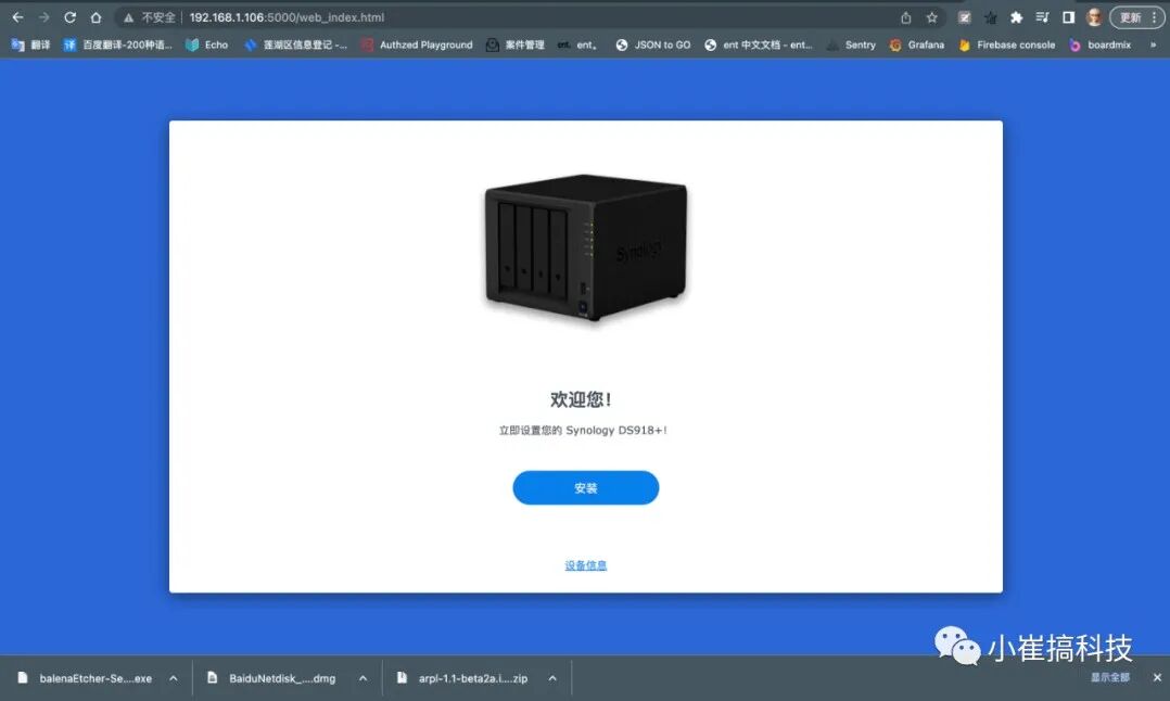 等待重启后电脑屏幕上显示出IP地址就可以访 问 https://finds.synology.com/ 或者电脑上显示的IP地址加5000端口(192.168.1.106:5000)寻找刚刚安装启动的NAS