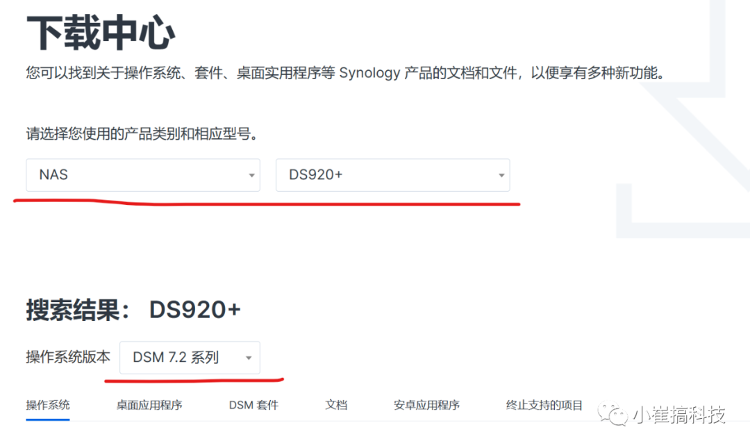 选择机型,需注意的是ds3615xs和ds3617xs不支持核显硬解,如有核显推荐选择918和920(920洗白码价格偏贵)这里演示用DS918+ 小编实际安装的是DS920+,不一定要一摸一样按需选择即可