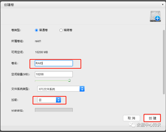 输入创建卷名称,在这里下面我们可以选择是否需要设置密码,如不设置,在这里大家点击创建即可。