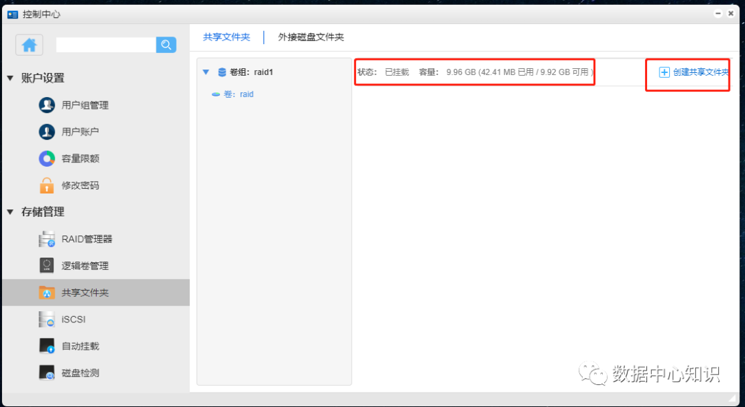 上方卷组创建完成后,选择共享文件夹就可以看到右边出现了我们创建的卷组。