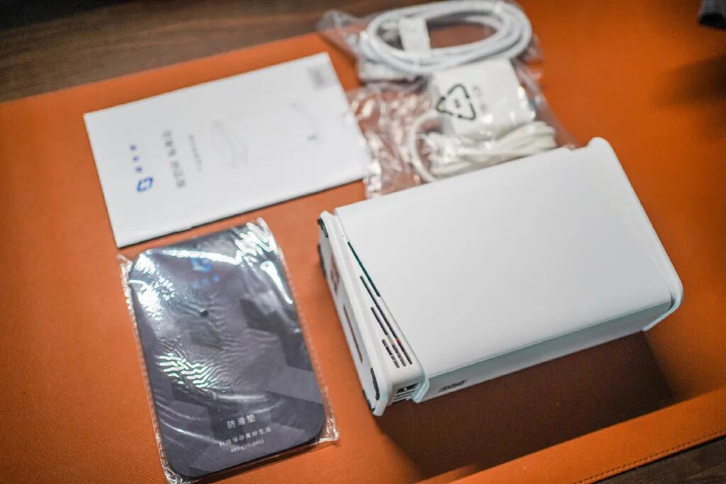 全家福,包括说明书、防滑隔音垫、网线、电源以及纯白色的Q2C本体。