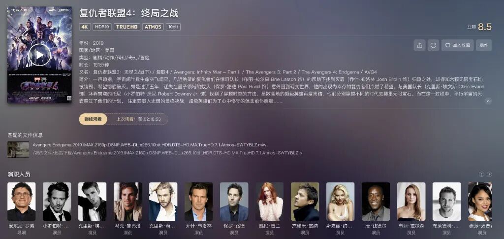 作为一个影视库,电影和电视的信息存储展示是最重要的,毕竟当你有几千部高清电影的时候,得迅速能找到最重要。极影视关联了下载文件夹后,自动刮哨、形成非常完整的影音库,而且之前经验是Z4下载了几百部电影居然每部都能找到信息,唯一一部没有的还可以手动搜索补上,确实是非常傻瓜但厉害的检索能力了,给大家看一看比如妇联4的刮哨信息,可以说很齐全。