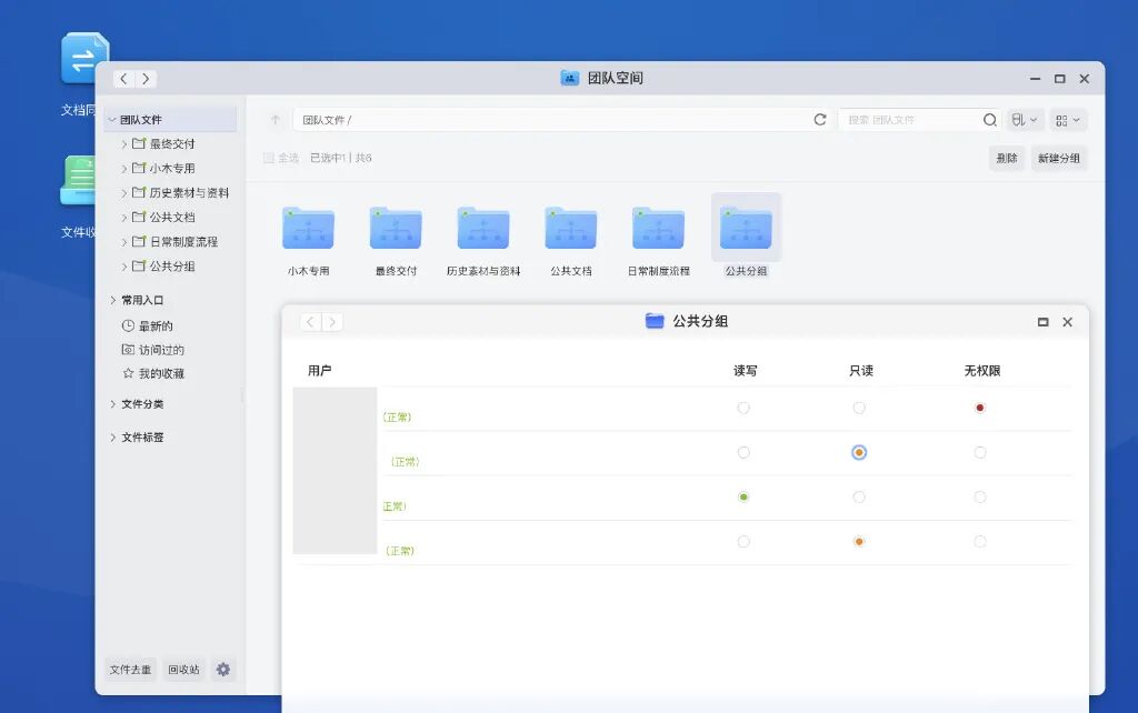 团队空间:对于小团队协作,极空间自带一个团队空间的入口,本质上是把一部分存储空间隔出来,便于几个挂载在极空间下的账号可以自由存储文件、开放可视和可编辑、同时空间管理员可以设置权限。类似于,百度网盘的企业版,只是极空间不需要一年百十块的费用,当然也不会有那么多特别细的功能,但足够用了。