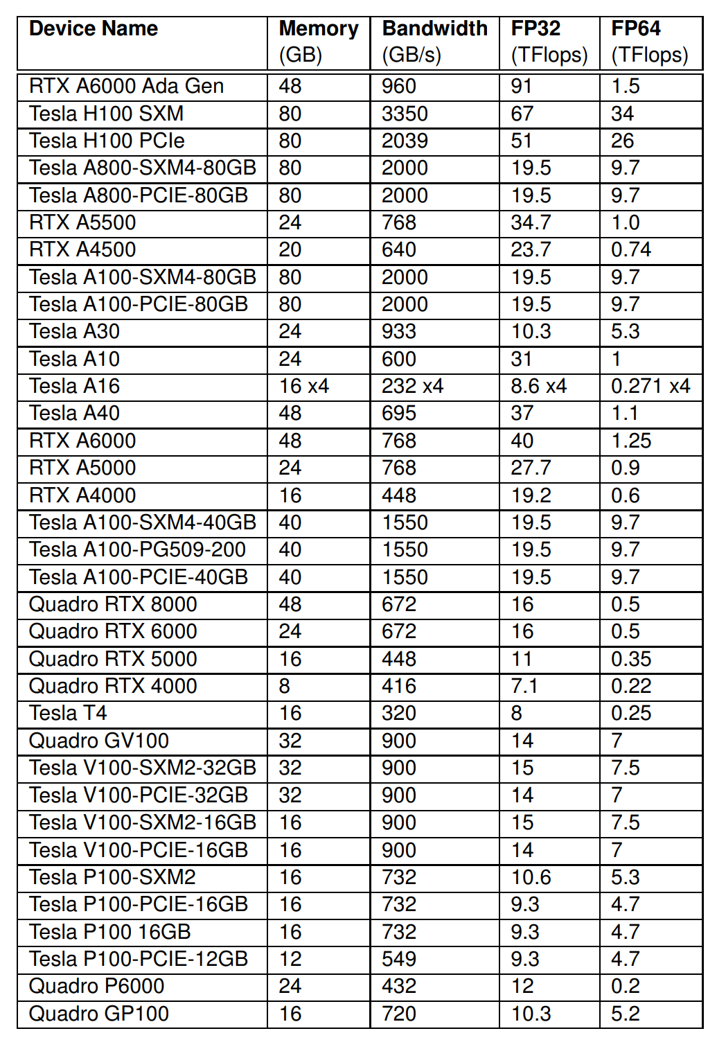 最重要的 单精度(FP32)和 双精度(FP64)性能方面,需要注意的是游戏卡的FP64算力砍得非常狠,最新Ada Lovelace 架构的游戏卡GPU的 FP64 性能是 FP32 性能的 1/64。