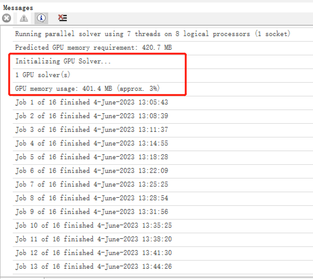 仿真完成之后,也可以在CST 的message窗口里查看GPU参与仿真加速的报告信息。