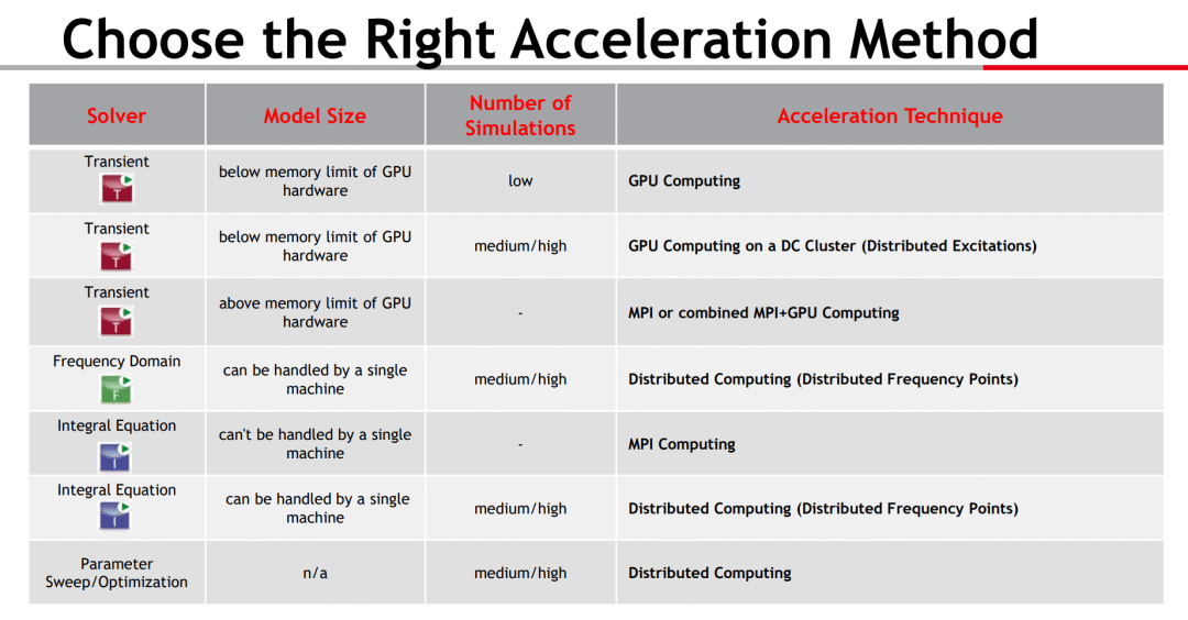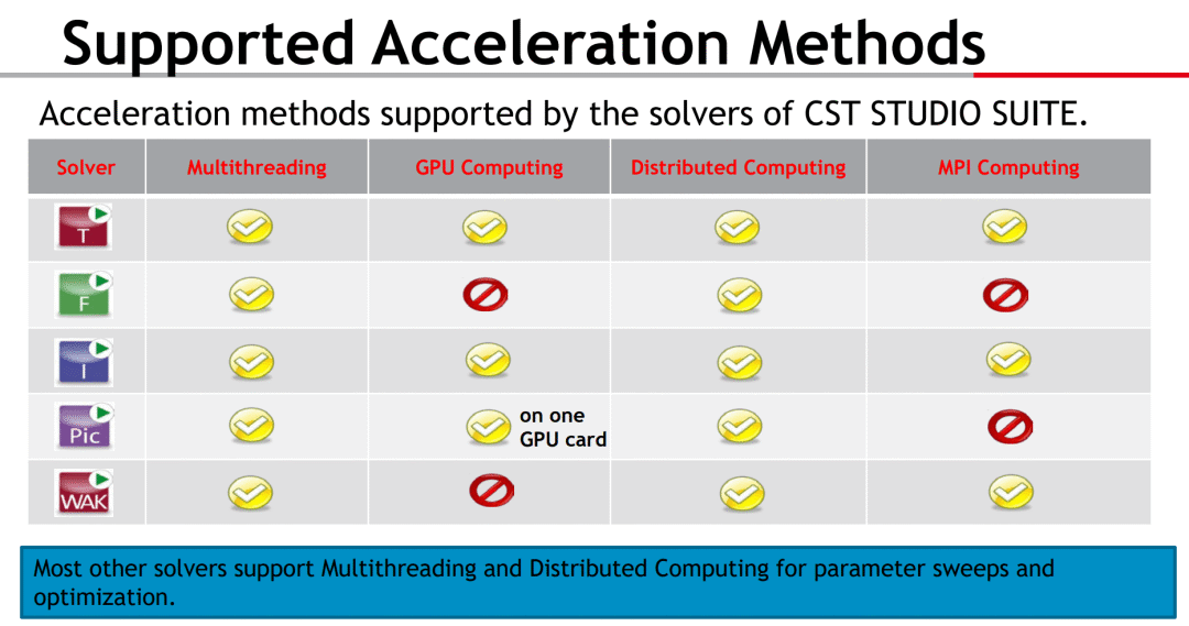 注意,并不是所有的 CST 求解算法都支持GPU加速以及MPI并行计算,GPU属于单机加速的层面,而DC分布式计算方式和MPI并行计算需要多台计算机组成,其中MPI需要连接Infiniband级别的网络装备,而DC分布式计算对网络带宽的要求相对较低,千兆甚至百兆联网带宽即可满足要求。