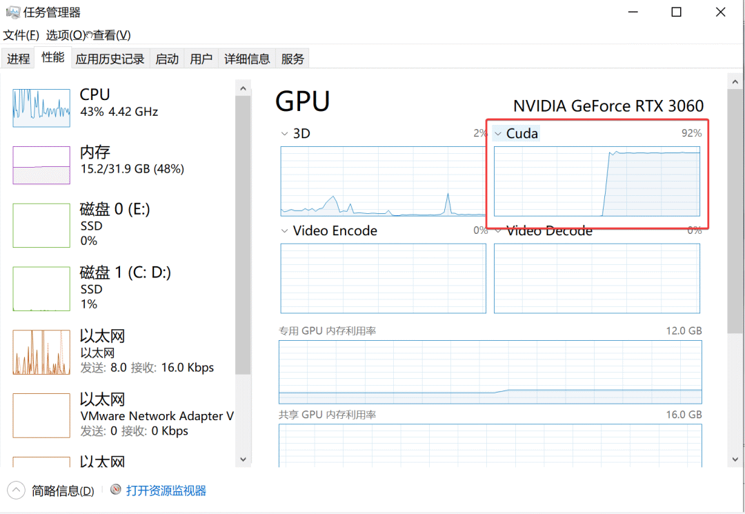 可以通过Windows的「任务管理器」性能中的GPU选项查看CUDA的调用信息,以了解实时的GPU参与计算的情况。