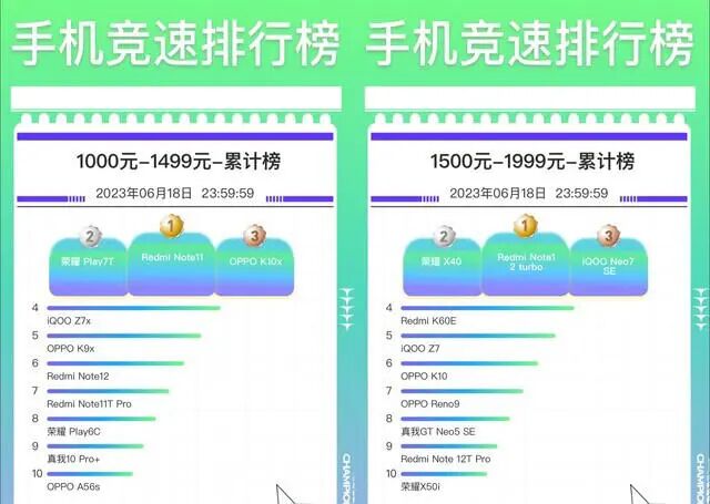 1000 元到 1499 元,Redmi Note11、荣耀 Play7T、OPPO K10x 拿到前三,iQOO Z7x 和 OPPO K9x 进入前五。