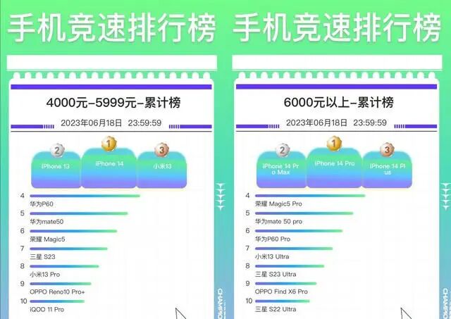 4000 元到 5999 元,高端对局,以前的牌桌上清一色苹果、华为和三星。不过,这次不一样,荣耀、小米、iQOO 和 OPPO 都有位置,表现非常亮眼。小米高端化终于有所回报,小米 13 作为一款标准旗舰,拿到销量第三,可见击中了很多用户的喜好。前两名分别是 iPhone 14 和 iPhone 13,想必有不少安卓用户转投了苹果。