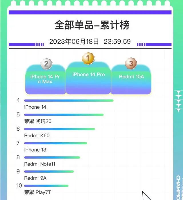 总榜方面,累计销量前三的手机分别是 iPhone14 Pro、iPhone14 Pro Max、Redmi 10A,iPhone 14 和荣耀畅玩 20 也进入前五。