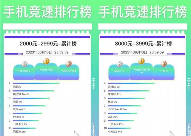 2000 元到 2999 元,Redmi K60、一加 Ace 2、iQOO Neo8 分列前三。K60 系列起售价仅 2099 元,价格优势非常明显。一加 Ace 2 和 iQOO Neo8 都是 12GB 大内存起步,性价比优势明显。