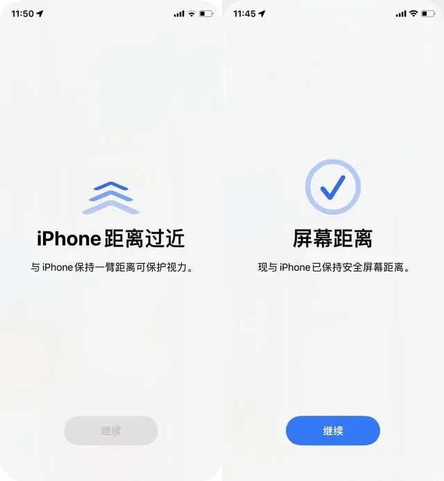 当长时间近距离盯着手机屏幕时,iPhone 会弹出干预窗口,提醒“iPhone 距离过近”,并建议“与 iPhone 保持一臂距离”。