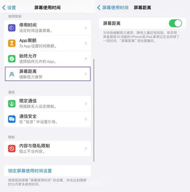 依次点击「设置 - 屏幕使用时间 -屏幕距离」,开启即可。