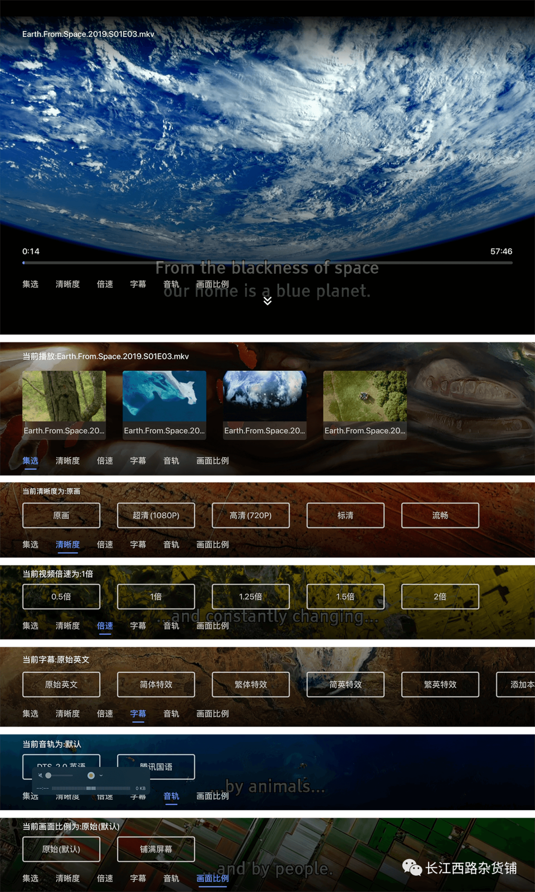 视频播放时,对集选/清晰度/倍速/字幕/音轨/画面比例等,均可调节。