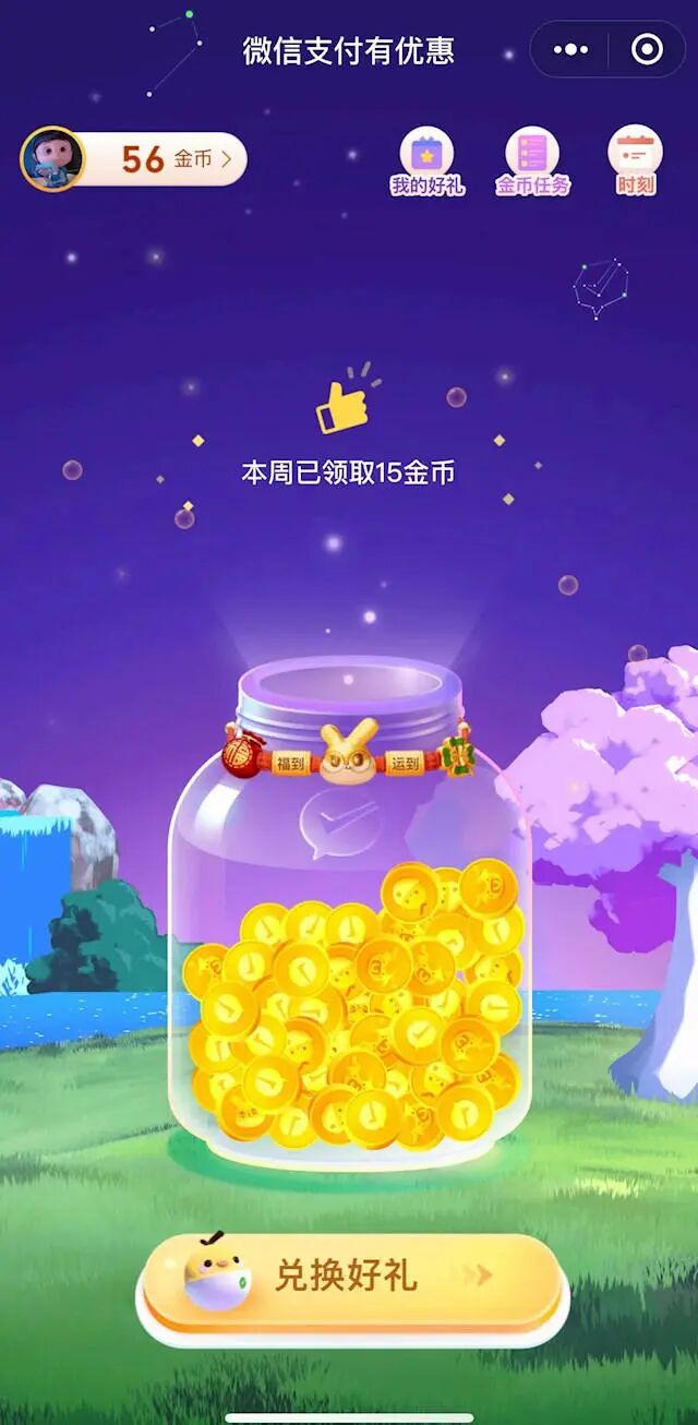 金币奖励按周统计,所有金币奖励均至少需要使用微信支付在商户处消费,且单次消费金额满1元以上;