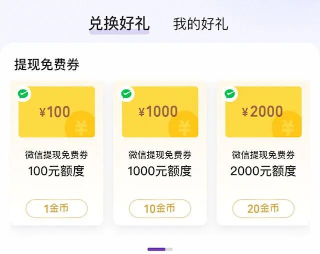 日前,微信支付有优惠的1000元、2000元微信提现免费券回归,前者需要10金币、后者需要20金币兑换。