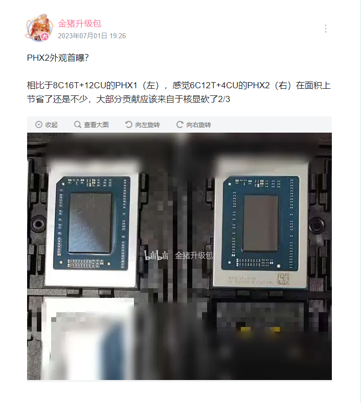 up 主 @金猪升级包 放出了最新的 Phoenix2 外观实拍图。从图中大家可以清楚看到,相比于左边的 8C16T+12CU 的 Phoenix,右边 6C12T+4CU 的 Phoenix2 在面积上小了很多。