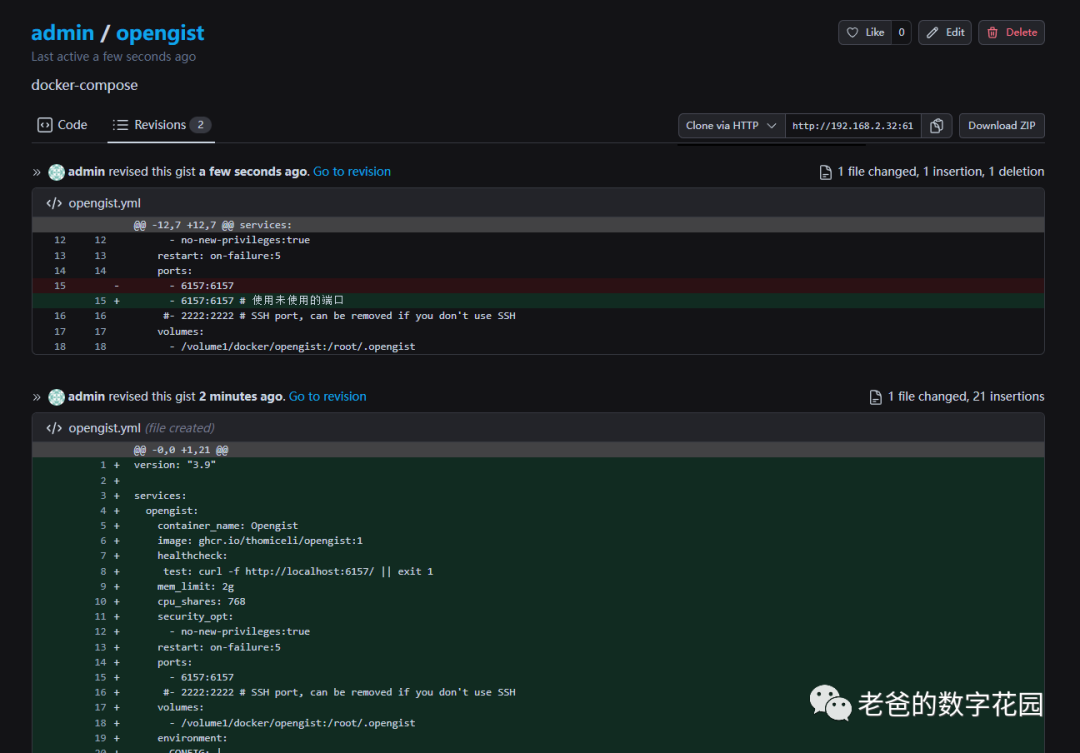 version: "3.9"services:opengist:container_name: Opengistimage: ghcr.io/thomiceli/opengist:1healthcheck:test: curl -f http://localhost:6157/ || exit 1mem_limit: 2gcpu_shares: 768security_opt:- no-new-privileges:truerestart: on-failure:5ports:- 6157:6157#- 2222:2222 # SSH port, 如果不需要ssh,可以去掉volumes:- /volume1/docker/opengist:/root/.opengistenvironment:CONFIG: |log-level: info