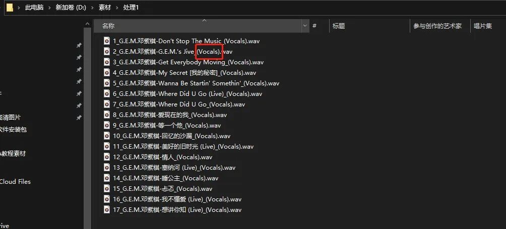 我们以歌声训练为例。首先我们会用到UVR5这个软件来将素材当中的伴奏、和声、人声(干声)进行分离。歌曲有不同的格式,常见的有MP3,WMA,WAV,APE,FLAC,OGG,AAC等。选择无损格式(APE,WAV ,FLAC等)的素材会得到更好的训练效果。由于WAV格式容量过大,用起来不方便,推荐使用FLAC。