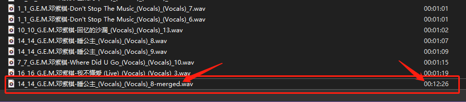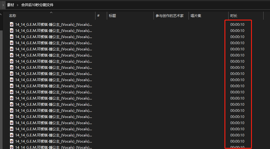 将几个切分文件夹中的文件汇总,删掉所有0-2秒的文件,并把剩下的长时间文件汇总起来,留给下一个软件来处理。