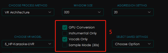 5.这个地方选择“GPU Conversion”和“Vocals Only”,下面两个选项不要勾选。勾选了VOCALS ONLY,就不会生成伴奏文件,后面声音的训练是不需要伴奏音的。如果勾选了Instrumental Only,只会生成伴奏文件,将不会生成人声+和声的文件。