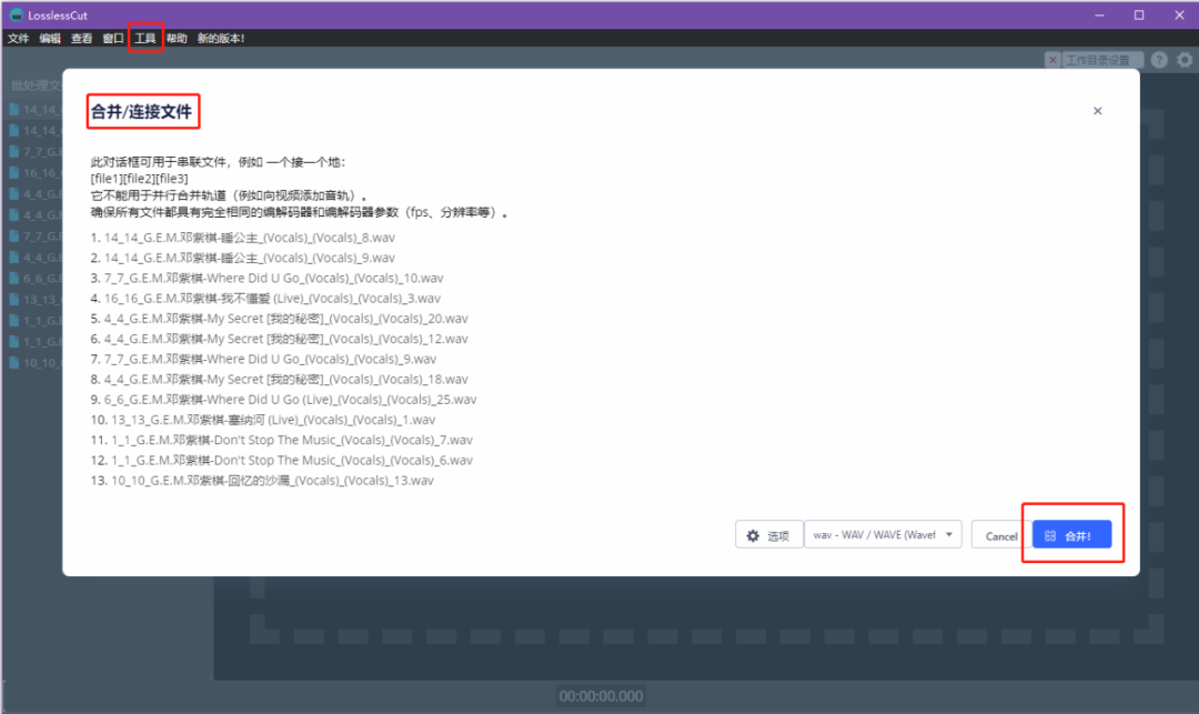 将长时间的素材文件全部拖入本软件,点击“工具”,点击“合并/链接文件”,将所选文件合并成一个文件。