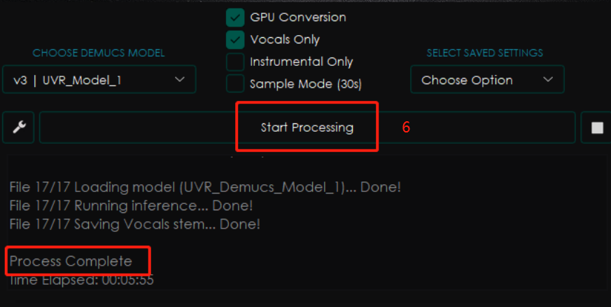 6.点击“Start Processing”开始处理。看到“Process Complete”后,表示已经处理完成。第二次处理后的文件名末尾会有带有“VOCALS_VOCALS”。至此,我们就得到了纯净干声素材。