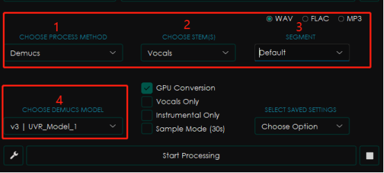 1.PROCESS METHOD(处理方法)选择“Demucs”