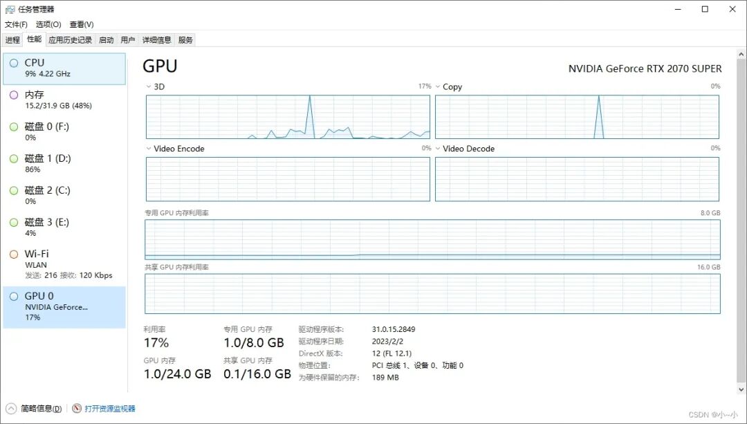 “batch_size”: 6,让机器同时学习多少个数据,越多占用显存就越多,要看看自己的显存多少来进行修改。可以在任务管理器查看 GPU 的内存,下面截图的显存为8G