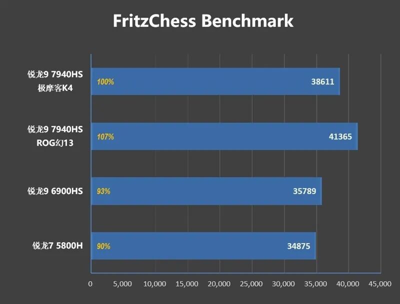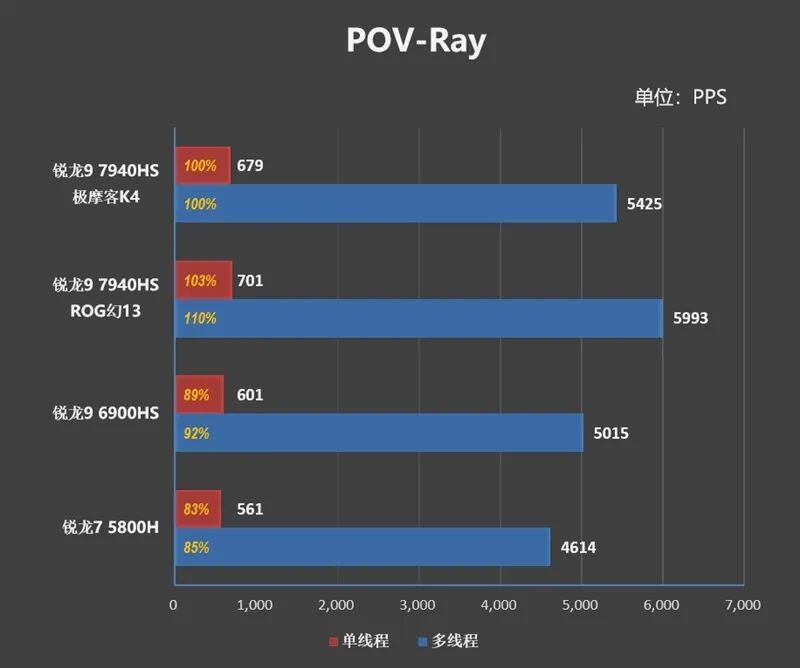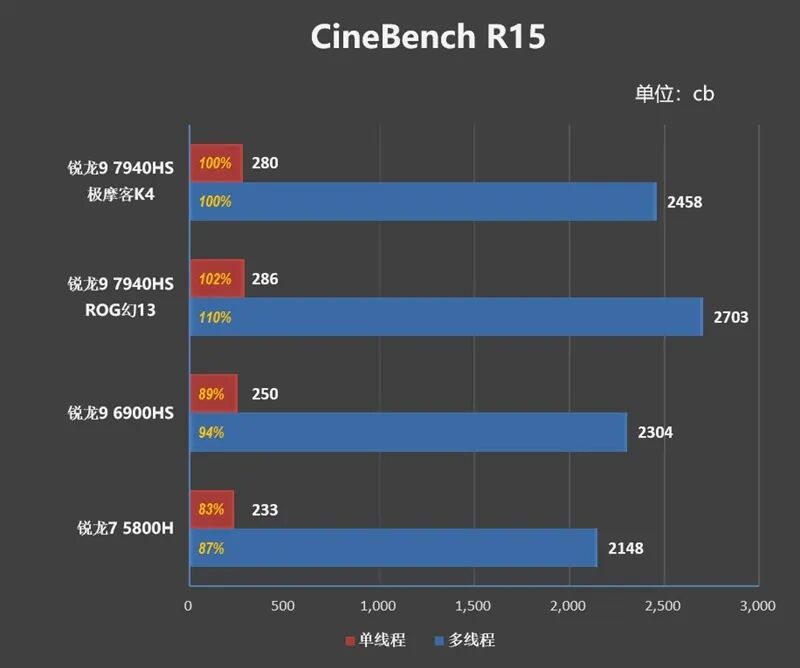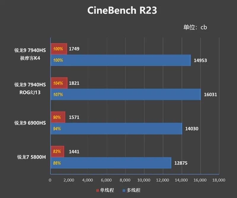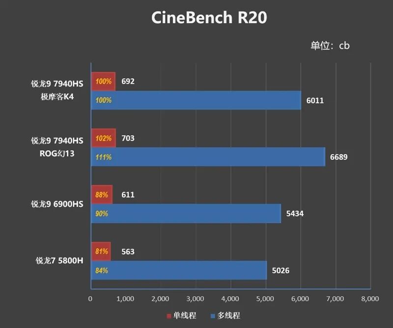 不过和同样采用了锐龙9 7940HS的ROG幻13比起来,极摩客K4的多核性能落后了9%之多,二者的性能释放都是45W。