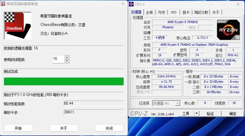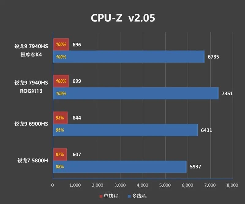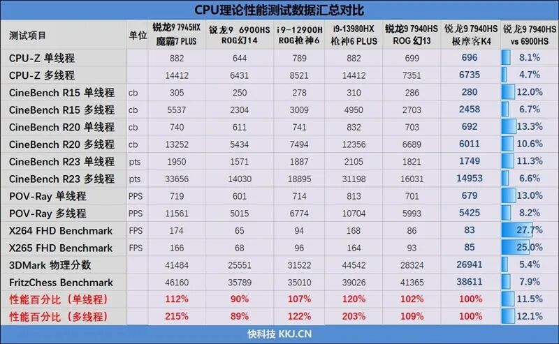 和上代的锐龙9 6900HS相比,锐龙9 7940HS的单核性能强了11.5%,多核性能强了12%。