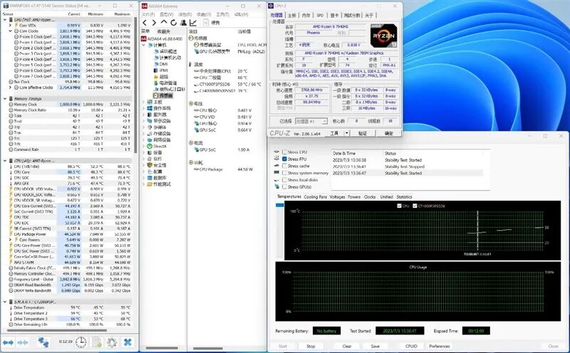 我们使用AIDA64 FPU进行了12分钟的烤机,极摩客K4可以稳定45W的性能释放,锐龙9 7940HS全核频率3.8GHz,温度88度,功耗稳定在45W。
