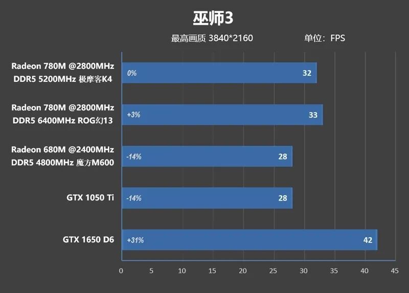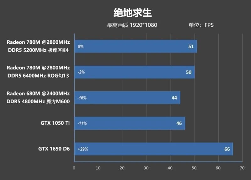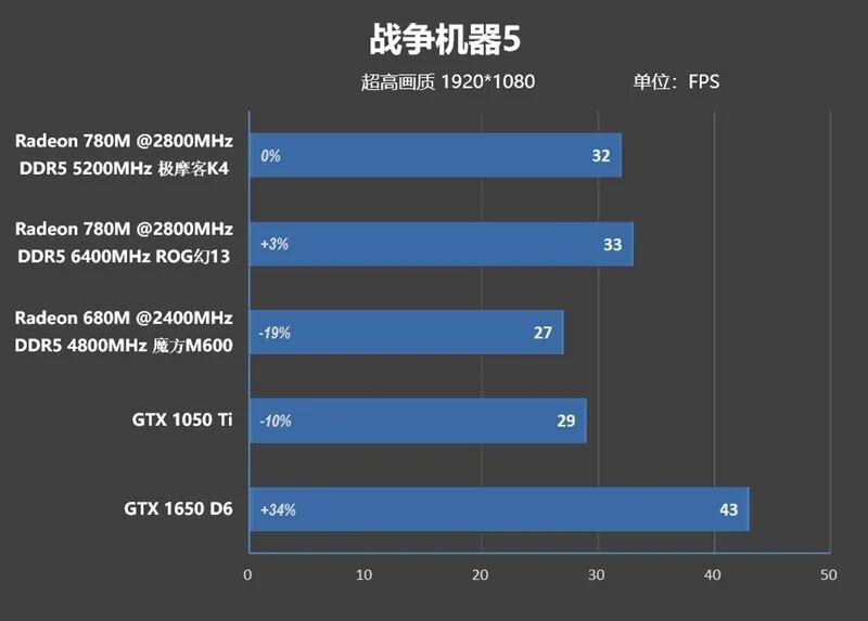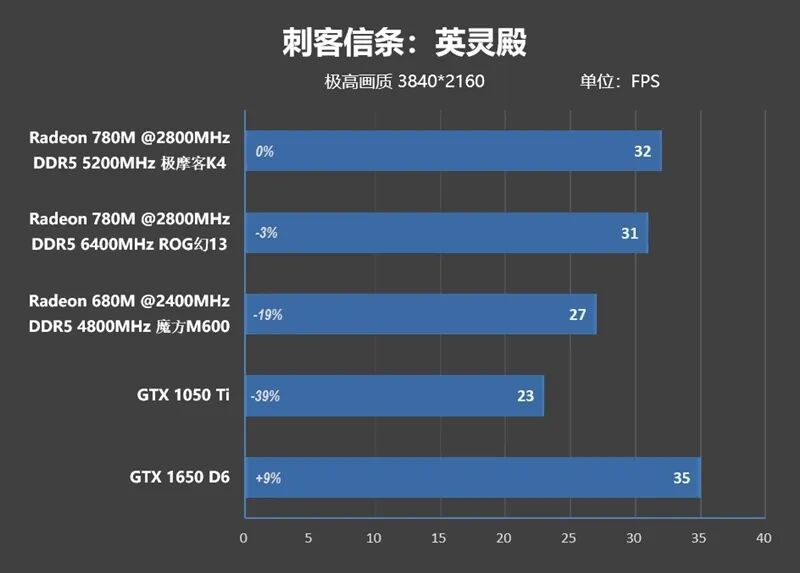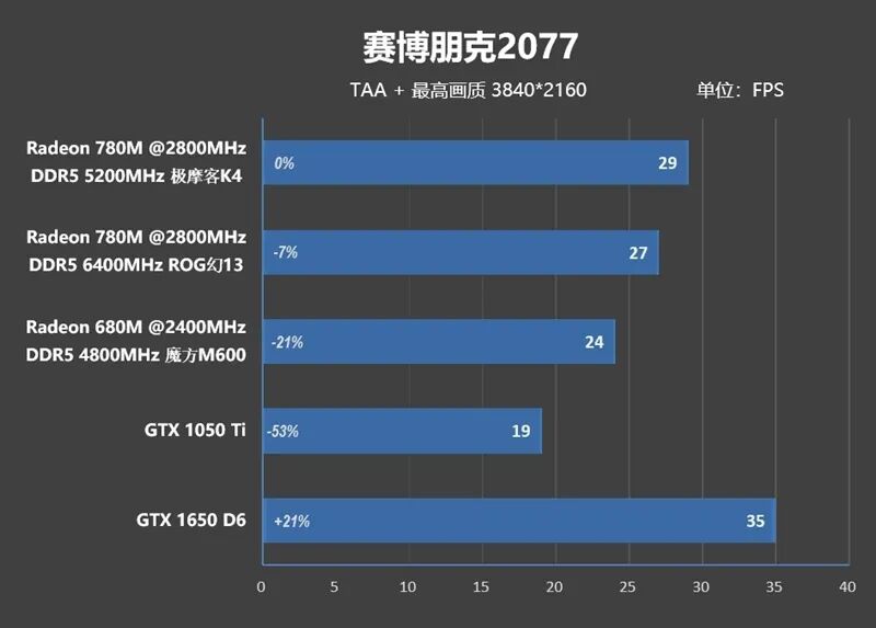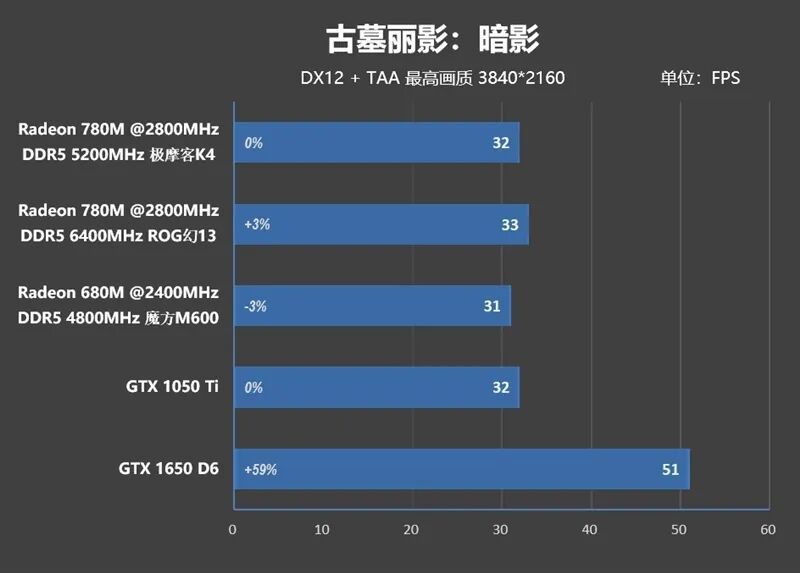 不过实际测试结果并不如人意,极摩客K4的游戏性能仅比魔方M600强了10%左右,这些提升完全可以看作是2800MHz的GPU频率和5200MHz内存频率带来的,Radeon 780M的RDNA 3构架相比前代的RDNA 2似乎是毫无提升。