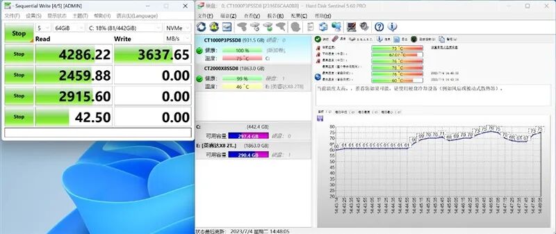 如果在系统高负载情况下进行SSD读写操作,英睿达P3 1TB SSD的温度甚至能达到76度,这就有点恐怖了。