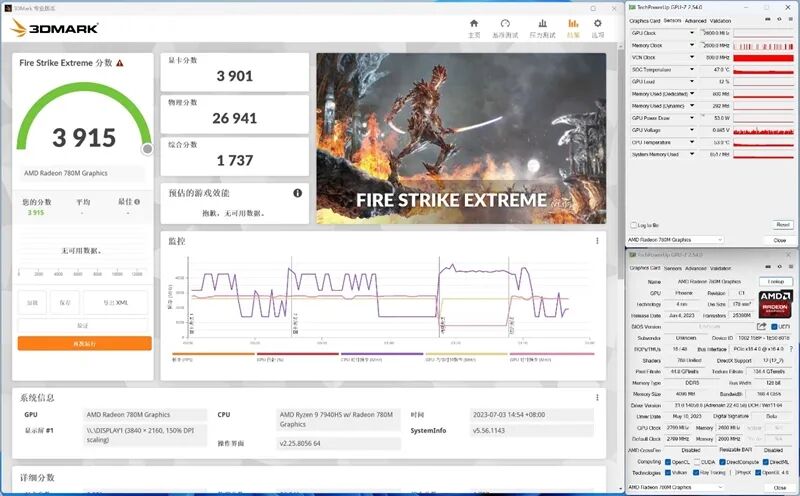 极摩客K4迷你主机搭载的是Radeom 780M集成显卡,在3DMark Fire Strike测试中,图形分数为3901,运行时最高频率为2800MHz,最高功耗53W。另外,锐龙9 7940HS的物理分数是26941。